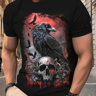 TEMU Męska koszulka z grafiką wróbla gotyckiego - czarna, casualowa koszulka z krótkim rękawem z krwawym wzorem czaszki, ciemna estetyka na letni