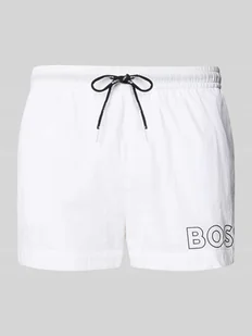 Męskie spodenki kąpielowe od BOSS;Model „Mooneye”;efekt: jednolity kolor;Aplikacja: Nadruk z logo;Ściągacz: elastyczny z tunelem;Kieszenie: boczne wpuszczane kieszenie