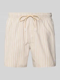 Męskie spodenki kąpielowe od BOSS;efekt: wzór na całej powierzchni;Kieszenie: z przodu boczne wpuszczane kieszenie, z tyłu kieszeń z wypustką z zamkiem błyskawicznym;Wzór: w paski;Wykończenie pasa: elastyczny tunel