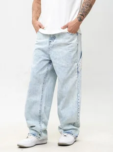 Spodnie Jeansowe Super Baggy Cargo Męskie Sprane Jasne Niebieskie Jigga Wear Base L Męskie spodnie jeansowe super baggy marki Jigga Wear. Materiał: 100% bawełna ✨ Jeansowe spodnie o obszernym kroju. Posiadają sześć kieszeni w tym jedną mniejsza na drobniaki oraz kieszeń na nogawce, szlufki w pasie umożliwiające założenie paska. Ozdobione haftem, paskiem na nogawce i spranym kolorze. ✨
