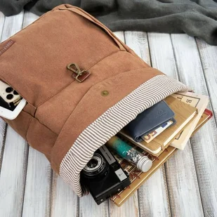 Model E–06 wykonano z połączenia trwałych materiałów – bawełny canvas oraz skóry wegańskiej 100%. Plecak uszyto mocnymi nićmi i w dbałości o detale, zastosowano bawełnianą podszewkę w paski. Zapięcie stanowi karabińczyk z pół-klapą, dodatkowo zabezpieczony od wewnątrz napą magnetyczną. Komora główna z powodzeniem mieści format A4. Dodatkowo we wnętrzu znajduje się mała kieszonka na suwak, na najpotrzebniejsze drobiazgi. Dodatkowo na bokach plecaka umieszczono pionowe kieszenie boczne na suwak.