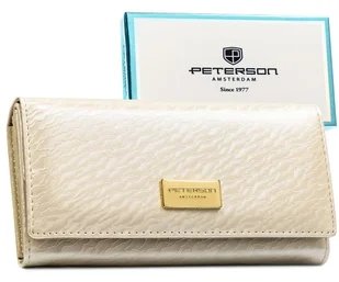 Portfel skórzany damski PETERSON skóra naturalna RFID STOP na prezent Duży portfel damski Peterson® w eleganckim kolorze ecru Elegancki, pojemny i dopracowany w każdym detalu – ten skórzany portfel damski Peterson® to idealne połączenie stylu i funkcjonalności. Wyróżnia się efektowną, tłoczoną fakturą w kolorze ecru oraz złotą blaszką z logo marki, która podkreśla jego ekskluzywny charakter. Dlaczego warto go wybrać? ❇️ Duży i bardzo pojemny – bez problemu mieści karty, dokumenty, banknoty i bilon. ❇️ Elegancka tłoczona skóra o unikalnej strukturze, odporna na codzienne użytkowanie. ❇️ Ochrona RFID – zabezpieczenie kart zbliżeniowych przed kradzieżą danych.