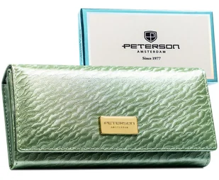 290 g Stylowa faktura i świeża elegancja w odcieniu mięty Portfel zachwyca tłoczoną, delikatnie falującą strukturą skóry, która subtelnie odbija światło i podkreśla jego wyjątkowy charakter. Modny, miętowy kolor nadaje mu lekkości oraz świeżości, a złota, metalowa plakietka z logo Peterson® tworzy eleganckie, luksusowe wykończenie.