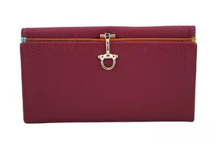Wnętrze portfela: w części zapinanej ozdobnym zapięciem wyodrębniono dwanaście miejsc na karty oraz ażurową kieszeń na dokument ze zdjęciem. Pod kartami, po obu stronach znajdują się cztery kieszenie na dokumenty, bilety i wizytówki oraz przegroda na banknoty. Pojemna kieszeń na zatrzask mieści bilon. Duży portfel ze złotym zapięciem i kolorowym wnętrzem będzie idealny rozmiarowo w torebkach klasycznych, plecakach, workach lub większych listonoszkach, może być także samodzielnym eleganckim dodatkiem do stylizacji.
