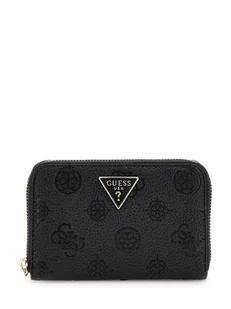 Portfel Guess wymiary: 13 x 9 x 2 cm materiał: 100% poliuretan kolor okuć: złoty skóra syntetyczna po zewnętrznej stronie 6 miejsc na karty dwie przegródki na banknoty kieszeń na bilon zamykana na zamek metalowe logo