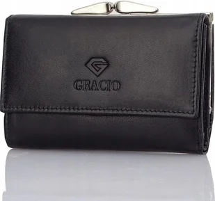 #️⃣ 3 przegródki na najczęściej używane kartyPortfel SKÓRZANY GRACIO mały DAMSKI RFiD Czarny Parametry surowiec: skóra naturalna marka: GRACII® kolor: czarny szerokość: 13 cm wysokość: