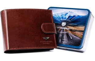 Skórzany męski portfel Peterson na zatrzask na karty z ochroną RFID, brązowy