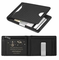 W skórzanym portfelu znajdować się będą tylko najpotrzebniejsze karty magnetyczne, banknoty, monety, a nawet zdjęcia najbliższych członków rodziny. Dobrze przemyślano jego funkcjonalność! W 9 praktycznych przegródkach schowaj kartę płatniczą, dowód osobisty, prawo jazdy i używane karty lojalnościowe. Jedna z przegródek umiejscowiona jest po zewnętrznej stronie, by ułatwić dostęp do często używanej karty. Może to tam będzie Twoja karta płatnicza? Wypełnij skórzany portfel, a on pozostanie nadal w rozmiarze SLIM! Wybierz projekt osobistej dedykacji i stwórz wspaniały, grawerowany prezent na zbliżającą się okazję . wymiary portfela - 11 cm x 8,5 cm x 1,5 cm wymiary opakowania - 19 cm x 14 cm x 2 cm materiał - naturalna skóra bydlęca wzór - karbon (na zewnątrz), gładki (wewnątrz) kolor - czarny na zewnątrz - 1 kieszeń na kartę (8,5 cm x 5,5 cm), w środku - 1 zamykana kieszeń na monety , 8 kieszeni na karty (8,5 cm x 5,5 cm) oraz klips na banknoty kolor - czarny personalizowany grawer z dedykacją dla bliskiej osoby produkt idealny na prezent - pakowany w specjalną torebkę upominkową z logo Maverton PORT-CAR-008