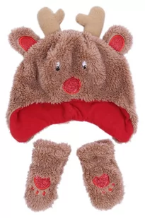 Zestaw: brązowa czapka z uszami i rogami - renifer + rękawiczki. Wykonane z ciepłego, miłego w dotyku materiału. Skład: 100% poliester