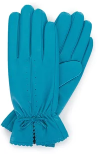 Rękawiczki z falbanką. Proste, choć pełne uroku rękawiczki ze skóry. Ich brzeg został wykończony stylową falbanką, a przy nadgarstku mają elastyczną koronkę i delikatną kokardkę, która zdobi ściągacz. Ozdobne perforacje wyglądają świetnie, ale pełnią również inną funkcję - zapewniają stały dopływ powietrza do dłoni, dzięki czemu rękawiczki są świetne również na wiosnę i jesień. Uszyte są z wysokiej jakości skóry naturalnej w jednolitym kolorze.