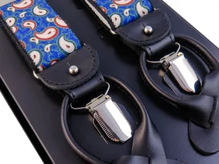 Niebiesko-czerwone szelki we wzór paisley na żabki i na guziki G61 Niebiesko-czerwone szelki we wzór paisley na żabki i na guziki. Dwie możliwości zapięcia d...