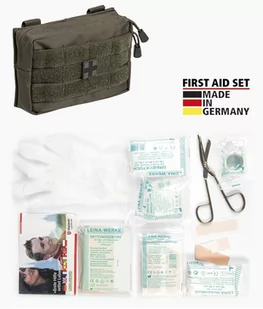 Apteczka MOLLE 25-piece First Aid Set z wyprodukowaną przez firmę Leina-Werke GmbH zawartością. Całość zamknięta jest w pokrowcu Belt Pouch Small w kolorze zielonym OD.