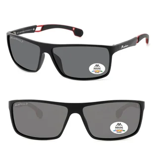 Wytrzymałe przeciwsłoneczne okulary męskie z polaryzacją i filtrem UV model - SP319 Oprawka wykonana z poliwęglanu w kolorze czarnym matowym z czerwonymi, ...