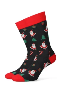 Ciemnogranatowe męskie skarpety z różnymi świątecznymi motywami i czerwonymi akcentami na palcach i piętach. Wzór przestawia mikołaje, choinki oraz prezenty....