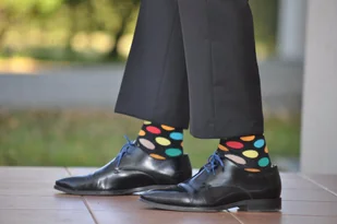 Oryginalne kolorowe skarpetki w wielokolorowe kropki, dla kobiet i mężczyzn. Różnorodność kolorów sprawia, że pasują do każdego stroju i dodają pozytywnej en...