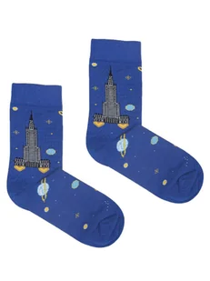 Pałac Kultury z rakietą w kosmosie kolorowe skarpetki we wzory Kabak