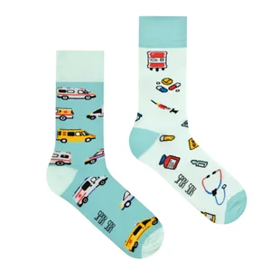 Z jednej strony na tle bladego turkusu ozdobione są różnorodnymi ambulansami, symbolizującymi ciężką pracę i determinację ratowników. Z drugiej na tle lazuro...