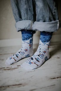 Zimowe szaleństwo na śniegu Skarpetki Zimowe Szaleństwo wzór pełen energii i radosnych atrakcji. Na białym tle rozgrywa się cała śnieżna opowieść – widać narciarzy zjeżdżających ze stoku, snowboardzistę robiącego skręty, dzieci lepiące bałwana, sanki pędzące po zboczu, a w tle wyciąg narciarski i zimowa, granatowa noc. Chłodne odcienie błękitu i granatu tworzą nastrojowy zimowy klimat, a drobne pomarańczowe akcenty dodają całości życia i kontrastu. To idealny wybór na mroźne dni, świąteczne stylizacje i dla wszystkich, którzy kochają zimowe sporty – choćby tylko w formie uroczego wzoru na skarpetkach. Dlaczego je pokochasz? zimowy motyw – narciarze, snowboardziści, sanki i bałwanki białe tło z błękitno-granatową scenerią – świeże i sezonowe miękka, oddychająca bawełna – wygoda przez cały dzień model unisex – idealne dla każdego fana zimy świetny pomysł na prezent – pełen zimowej energii i radości Skarpetki Zimowe Szaleństwo to mała dawka zimowej adrenaliny, którą możesz nosić przez cały sezon.