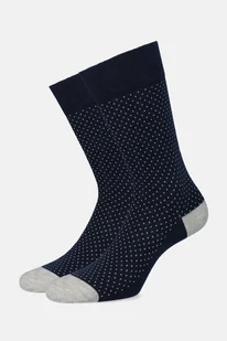 Skarpety męskie w kolorze granatowym w kropki to doskonały wybór dla tych, którzy poszukują trwałych i wygodnych skarpet. Wykonane z mocnej dzianiny, w której dominuje bawełna, z niewielką domieszką poliamidu i elastanu. Zapewniają trwałość i zachowują swój kształt nawet po wielu praniach i długotrwałym użytkowaniu. Główne cechy tych granatowych skarpet to: Dbałość o higienę i zdrowie stóp nawet po całym dniu noszenia, dzięki wysokiej zawartości bawełny.