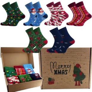 41-43 Ilość par w zestawie: 6 Fason: Długie Kolor: Multikolor Wzór: kratka świąteczna, mikołaj, pierogi, choinka, bałwanki, piernik Materiał: 80% Bawełna, 17% Poliamid, 3% Elastan Rodzaj: