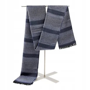 granatowo - szary wzór: geometryczny materiał: miła w dotyku akrylowa włóczka w przeciwieństwie do wielu włókien, akryl nie uczula, materiał jest przyjemny dla ciała, ładnie się układa właściwości termoizolacyjne zapewniające ciepło miękki jak kaszmir duży wymiar: szer. 30 cm x dł. 180 cm wykończony frędzlami producent: