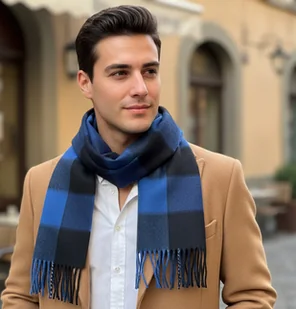 Szalik Męski Granatowy Niebieski Kratka Wełna