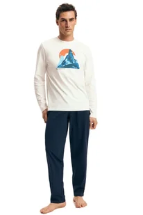 Piżama męska Loji 43475 – komfort w naturalnym wydaniu Klasyczna piżama męska wykonana w 100% z bawełny to propozycja łącząca wygodę i funkcjonalność. Zestaw składa się z bluzki z długim rękawem w kolorze ecru z graficznym nadrukiem górskiego pejzażu oraz spodni w kolorze granatowym . Elastyczna talia z gumą z napisem „Henderson” zapewnia doskonałe dopasowanie i podkreśla nowoczesny charakter zestawu. Całość utrzymana w stonowanej kolorystyce nadaje się zarówno do snu, jak i domowego relaksu. ☑️ 100% bawełna – miękkość i przewiewność ☑️ Bluzka z długim rękawem – idealna na chłodniejsze noce ☑️ Spodnie z prostą nogawką – swoboda i wygoda ruchów ☑️ Elastyczna talia z gumą „ Henderson ” ☑️ Oryginalny nadruk inspirowany naturą Piżama to doskonały wybór dla mężczyzn ceniących prostotę, wygodę i stylowy minimalizm .