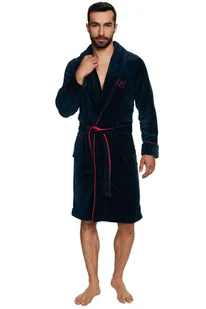 Miękki, gruby i ciepły szlafrok męski wykończony czerwoną lamówką. Elegancki, ciepły i przyjemny w dotyku szlafrok męski z kołnierzem . Długość do kolana zapewnia odpowiedni komfort cieplny i stylowy wygląd. Wiązanie w pasie pozwala na idealne dopasowanie, a dwie praktyczne kieszenie doskonale sprawdzą się na drobiazgi, które potrzebujemy mieć zawsze przy sobie. Szlafrok wykończony jest czerwonymi wstawkami , które świetnie współgrają z granatowym kolorem.