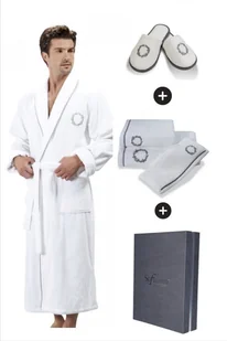Męski szlafrok SEHZADE w ozdobnym opakowaniu + ręcznik + kapcie XL + kapcie (42/44) + ręcznik + box Biały / srebrny haft