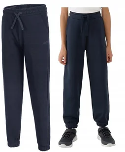 Dziewczęce, bawełniane spodnie dresowe 4F Marka/Model: 4F JTROF1509 Kolor: Granatowy ciemny Materiał: 80% bawełna, 20% poliester Ocieplane wnętrze Kieszenie: 2 boczne Sznurek w pasie Ściągacze nogawek O marce: