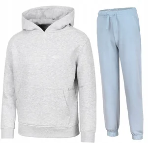 Dziewczęcy dres sportowy 4F Marka/model: 4F JSWSF1862 / JTROF1249 Kolor: Bluza jasny szary melanż / spodnie jasne niebieskie Materiał: 78% bawełna, 22% poliester, Ocieplane wnętrze bluzy i spodni Kieszeń typu kangurka w bluzie Kieszenie spodnie: 2 otwarte Ściągacz na dole i przy rękawach Sznurek w pasie Zintegrowany kaptur O marce: