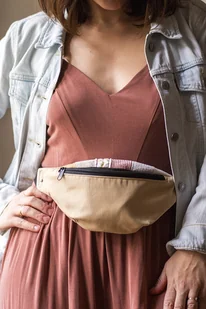 Nerka średniej wielkości w kolorze beżowym. Kolorowa patchworkowa klapa. Nerka zapinana jest na suwak i zamocowana na czarnym, parcianym pasie o regulowanej długości. Wewnątrz saszetki jasna, baweł ...