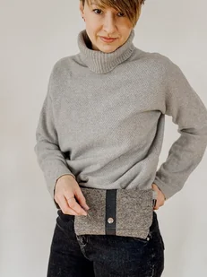 Torebka filcowa mała SZAROBRĄZOWA z czarnymi dodatkami, z wewnętrzną kieszonką Niewielka torebka jest wykonana z grubego wełnianego filcu w kolorze szarobrązowym. Ma regulowany pasek wykonany z czarne ...