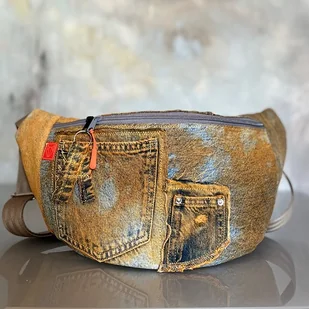 Upcyklingowa duża nerka, w całości wykonana z ze spodni jeansów z second hand – dając nowe życie wyrzuconym materiałom i zamieniając je w nowoczesną i ekologiczną torebkę. Każda nerka jest pojedynczym e ...