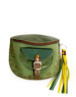 Praktyczna torebka na pas uszyta z zielonych skór naturalnych o różnych odcieniach i fakturach. Ręcznie wypalony motyw jesiennych liści. Niewielka ale pojemna, pomieści telefon, portfel, chusteczki i najpo ...
