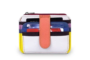 Etui marki Nicole z naturalnej skóry licowej. zamykane paskiem z zatrzaskiem staranne wykonanie logo na froncie etui jedenaście kieszonek na karty lub dokumenty, w tym jedna z okienkiem jedna kieszonka zamykana na suwak zapakowane w firmową chustę i pudełko