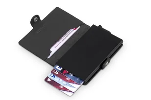 Etui na karty i dokumenty, wykończone naturalną skórą licową. Posiada metalową kopertę z mechanizmem wysuwającym karty. Wyposażone w RFID PROTECTION - system, który chroni karty płatnicze. To specjalne zabezpieczenie w ścianie etui blokuje czytniki zbliżeniowe. Uniemożliwia to pobranie pieniędzy z karty bez Twojej zgody.