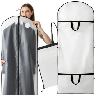 Ochronny pokrowiec garderobiany zabezpieczający odzież przed kurzem wilgocią i zagnieceniami Rodzaj: pokrowiec wiszący na ubrania Wymiar(szer. x dł.): 60 x 180 cm Kolor: jasny z czarnym obszyciem Zamykanie: zamek błyskawiczny na całej długości Materiał: