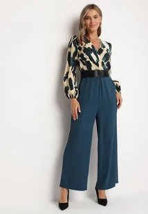 Beżowo-Niebieski Kopertowy Kombinezon z Górą Ozdobioną Abstrakcyjnym Wzorem z Dodatkowym Paskiem Coristina