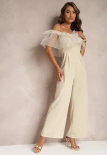 Beżowy Koktajlowy Kombinezon z Falbanką przy Dekolcie bez Rękawów Tessita