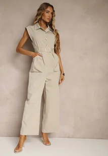 Beżowy Taliowany Kombinezon z Guzikami i Cyrkoniami Lumalise