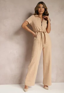 Beżowy Bawełniany Kombinezon z Prostymi Nogawkami z Zamkiem i Paskiem w Talii Olroura