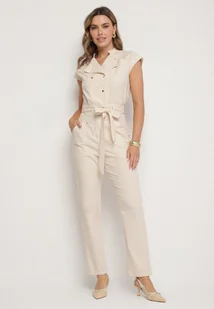 Beżowy Kombinezon z Wiskozą o Koszulowym Kroju z Wiązanym Paskiem i Napami Sepalisa