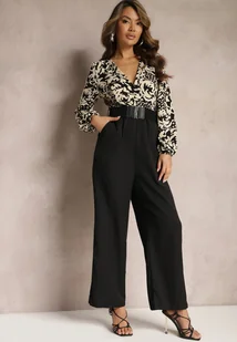 Czarno-Beżowy Kombinezon z Paskiem Góra w Print i Trójkątny Dekolt Hamiora