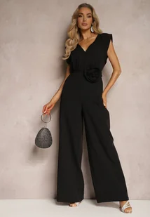 Czarny Kombinezon Wykończony Prostymi Szerokimi Nogawkami z Wiskozą i Kwiatem 3D Dimentia