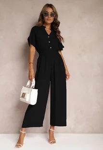 Czarny Taliowany Kombinezon z Wiskozy Zapinany na Guziki Frisea