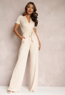 Jasnobeżowy Długi Kombinezon z Wiązaniem i Kopertowym Dekoltem Novaya