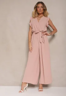 Jasnoróżowy Koktajlowy Kombinezon Wiązany Paskiem Wykończony Falbankami przy Ramionach Vimaseni