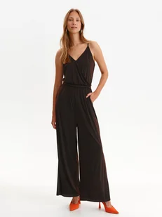 Kombinezon damski Top Secret z kopertowym przodem. Niespotykanie uroczy i pełen elegancji długi kombinezon damski o luźnym kroju bez rękawów na cienkich regulowanych ramiączkach. Posiada on efektowny dekolt w kształcie litery V z przodu oraz zmysłowo odkryte plecy. Uroku dodają mu szerokie długie nogawki oraz kopertowy przód z gumką w talii, pięknie podkreślający smukłość i powab kobiecej sylwetki. Kombinezon dostępny w kolorze brązowym SKB2786BR.