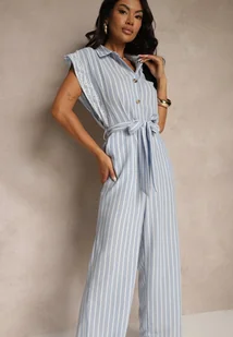 Niebieski Bawełniany Kombinezon o Koszulowym Kroju z Wiązanym Paskiem Amerlia